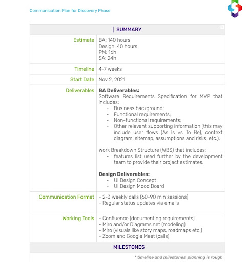 At the end of the Discovery phase, it is important to present the outcomes of the completed discovery weeks to a wider group of stakeholders during a Discovery wrap-up session. This session provides an opportunity to finalize the scope, summarize the discovery process, and discuss the next steps for the possible delivery stage.