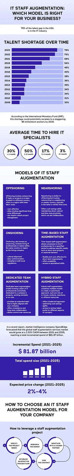Time-based staff augmentation involves hiring IT professionals for a specified period or on a project-by-project basis. This model offers flexibility and cost control, as you pay for services rendered during the agreed-upon timeframe.