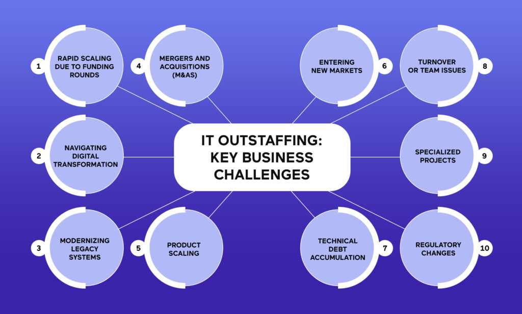 IT outstaffing is ideal for businesses facing key challenges like rapid project scaling, accessing specialized skills, or managing fluctuating workloads. This model provides the flexibility to adapt to changing business needs while maintaining control over project execution.